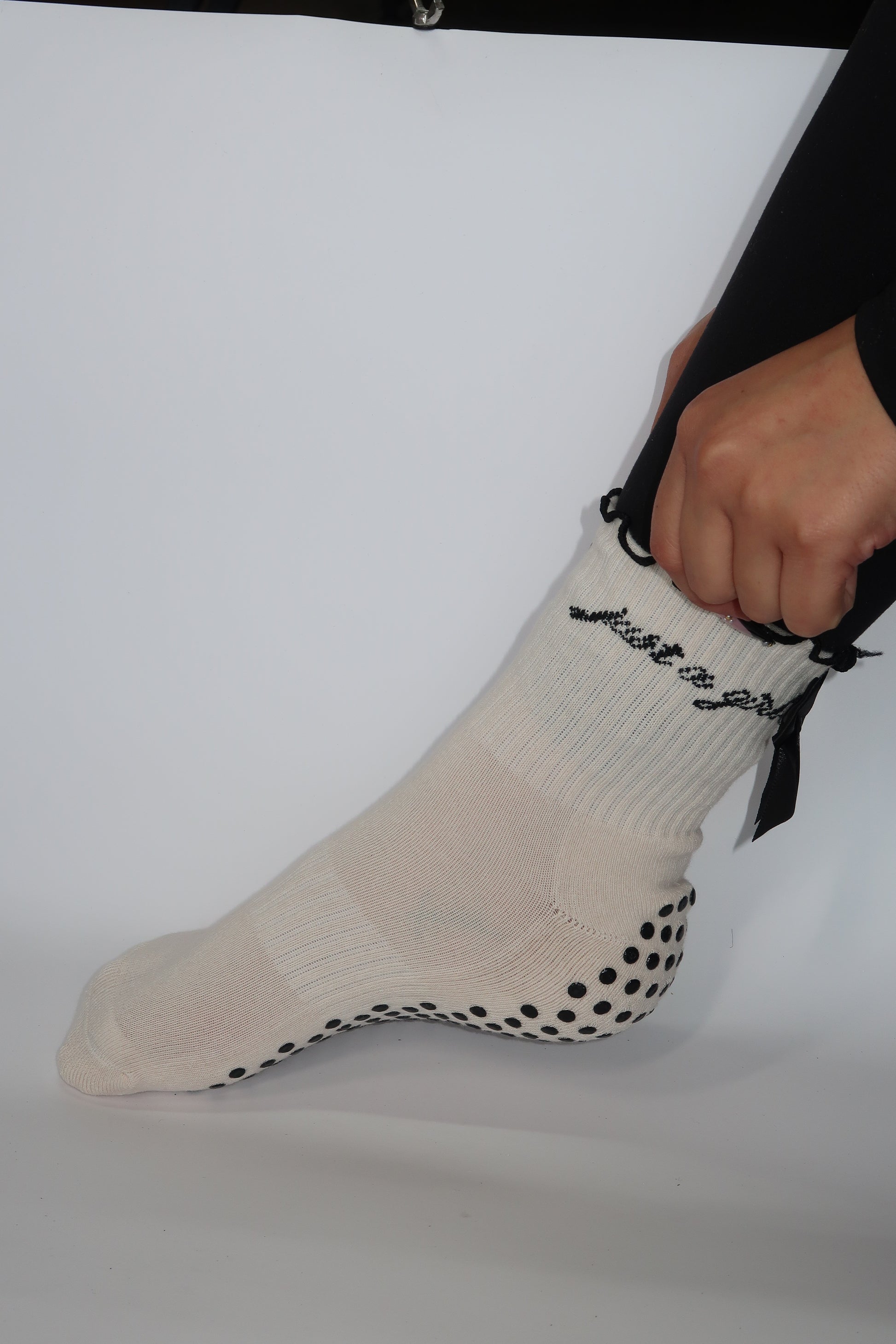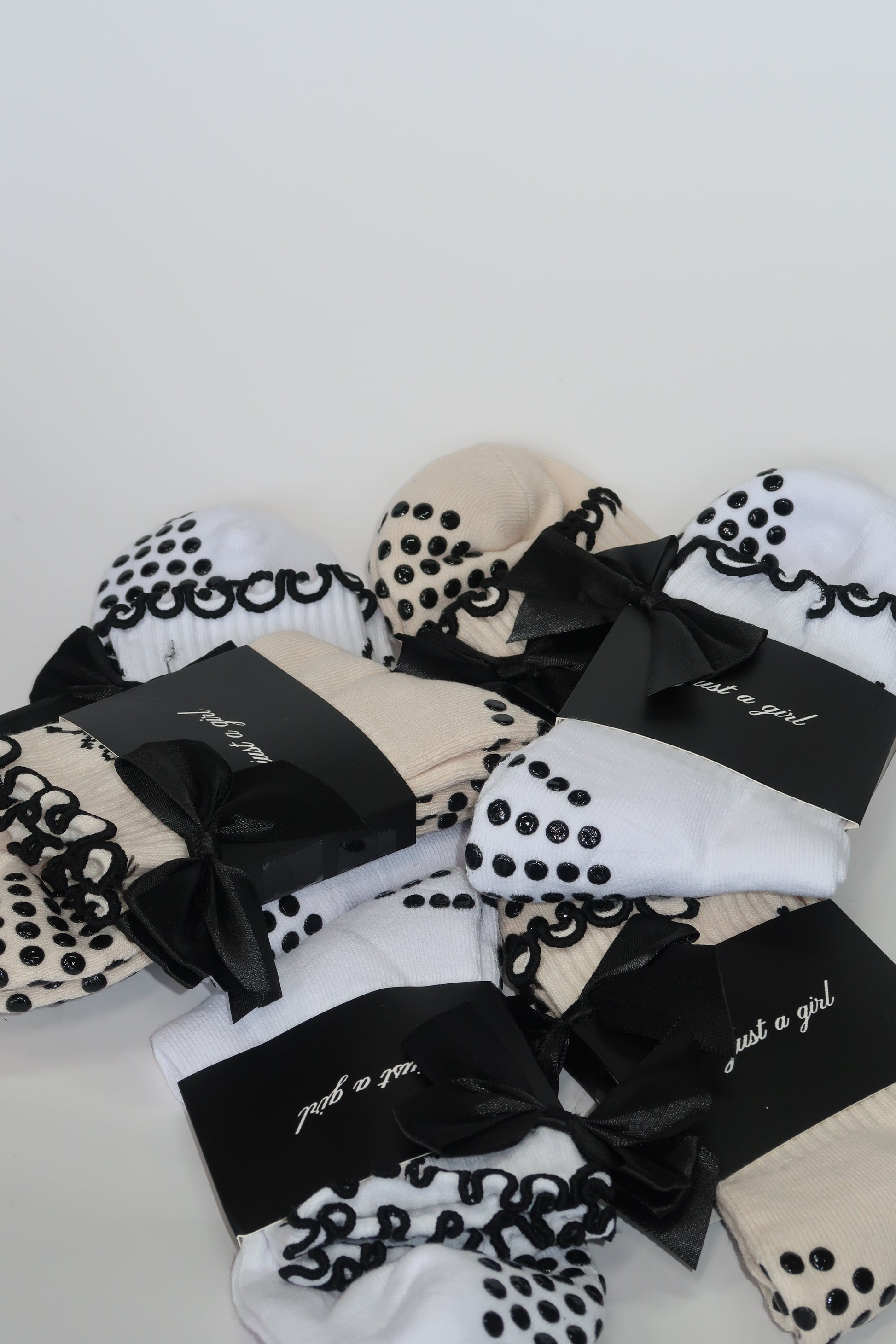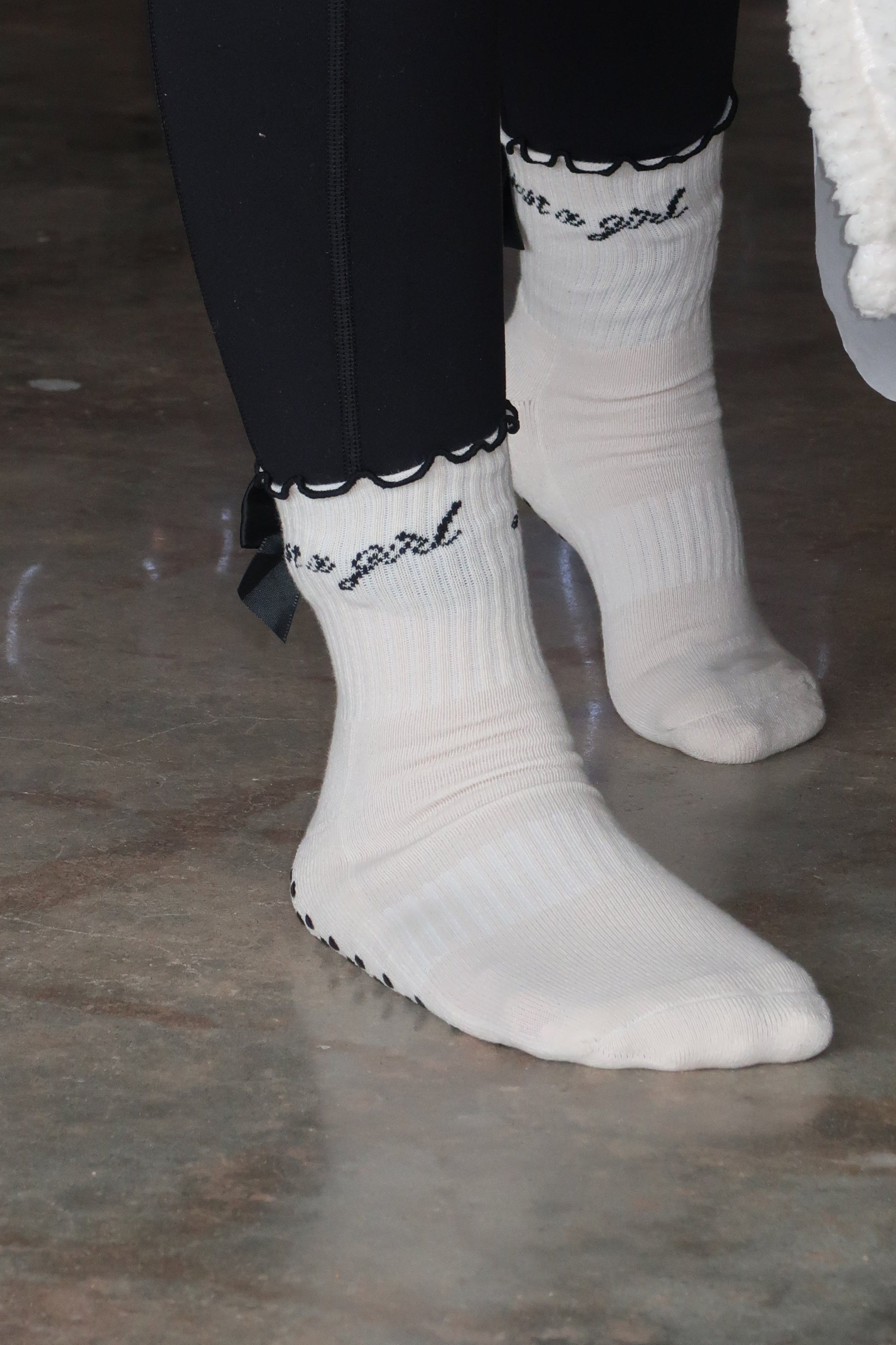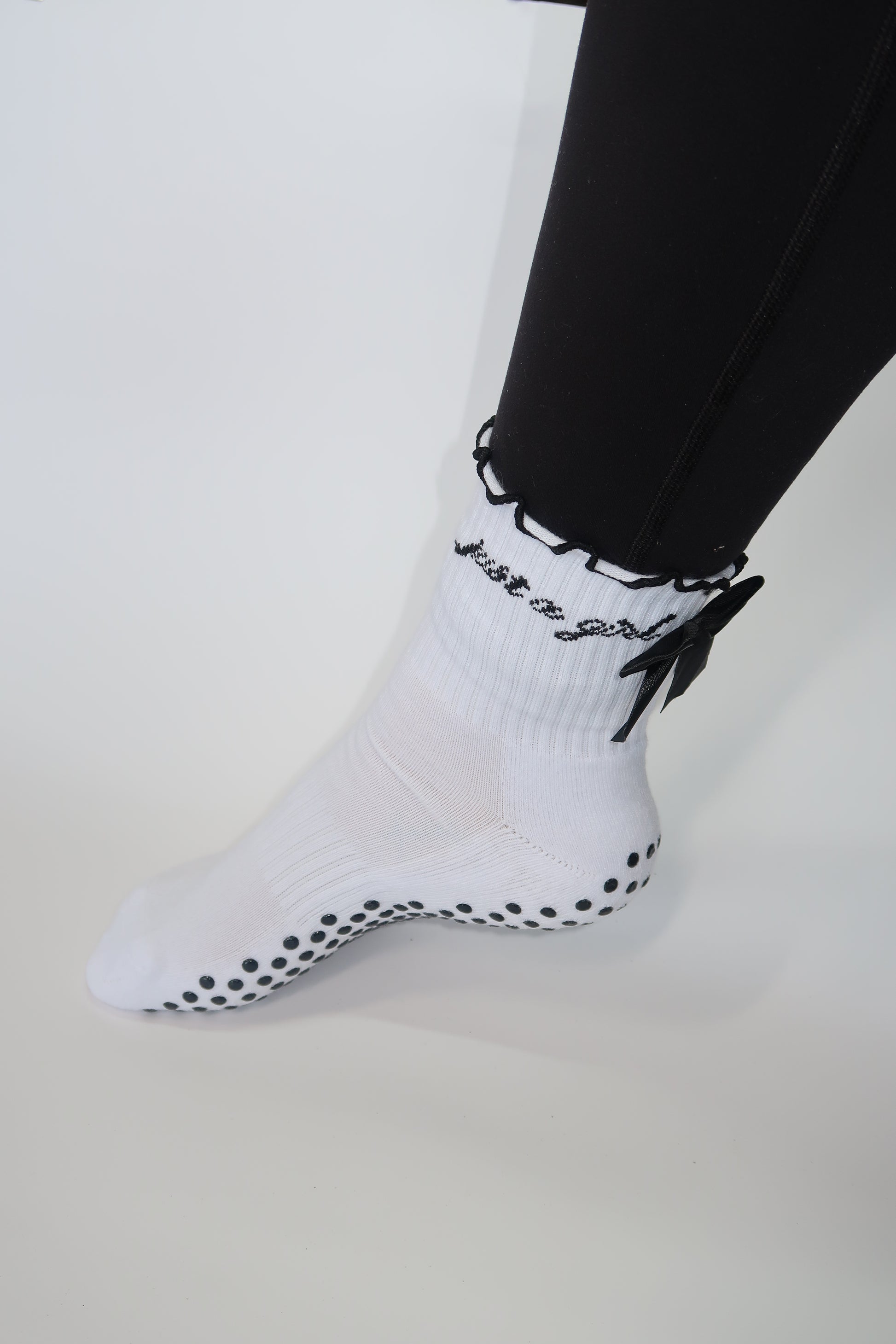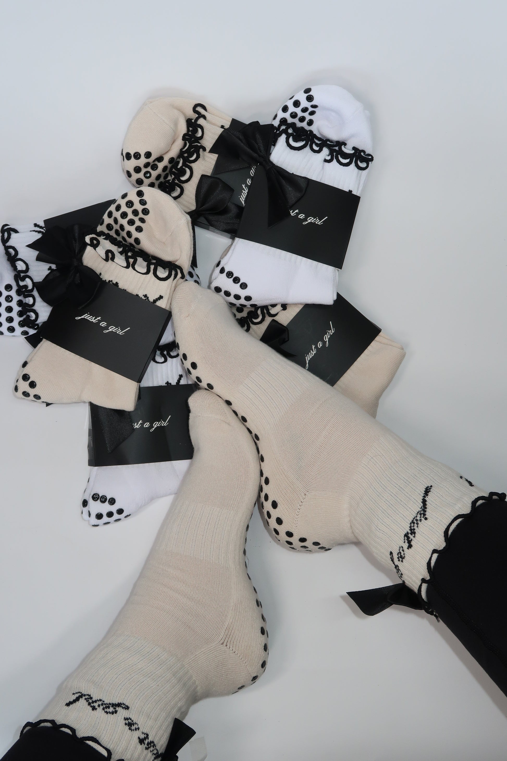 Whether you’re heading to Pilates, barre, or just channeling your inner "clean girl" on a Sunday morning, our Just a Girl Grip Socks are the perfect blend of cozy, cute, and functional. Designed for movement, but made to serve looks — because being just a girl is powerful in its own way.
